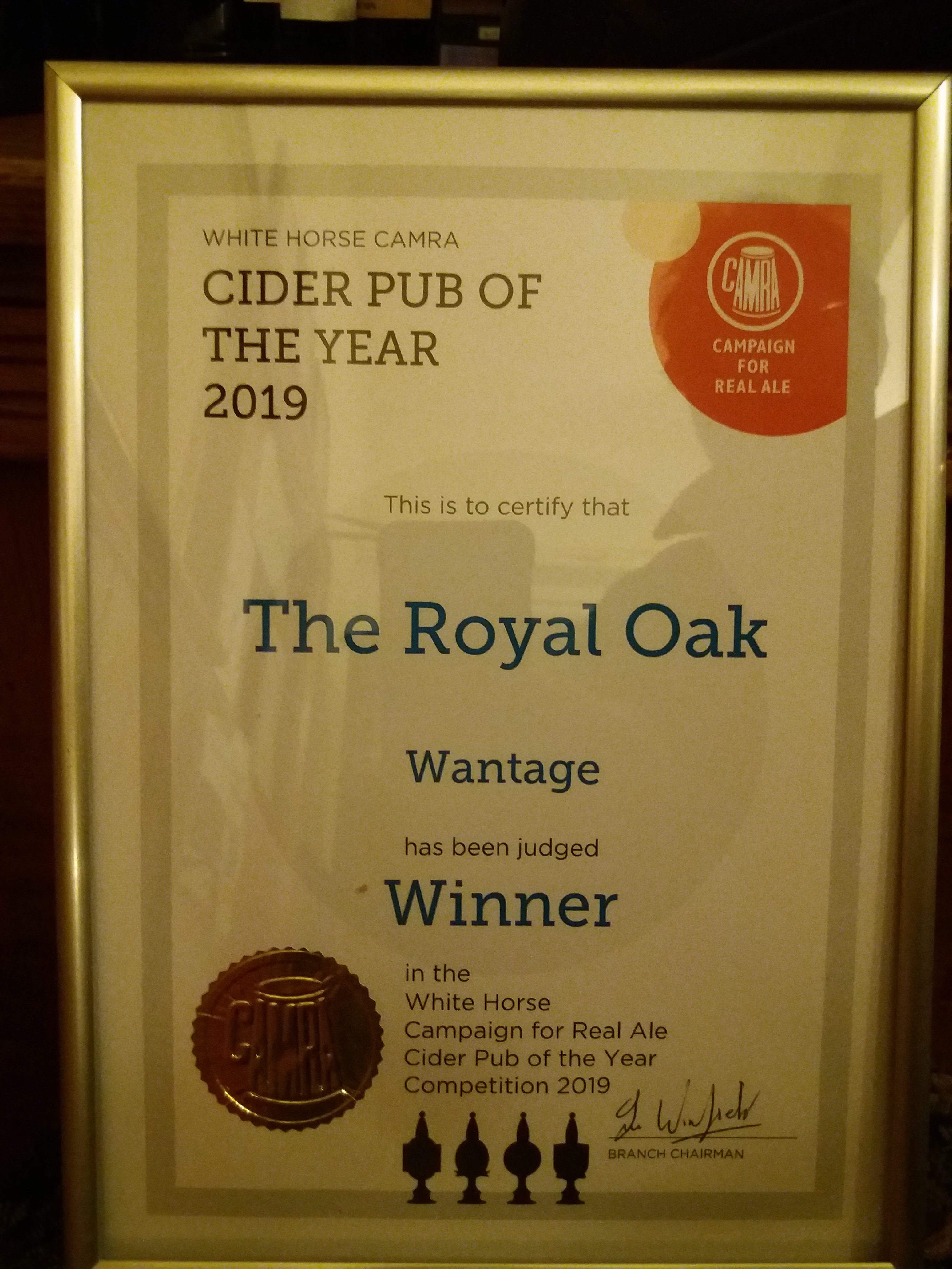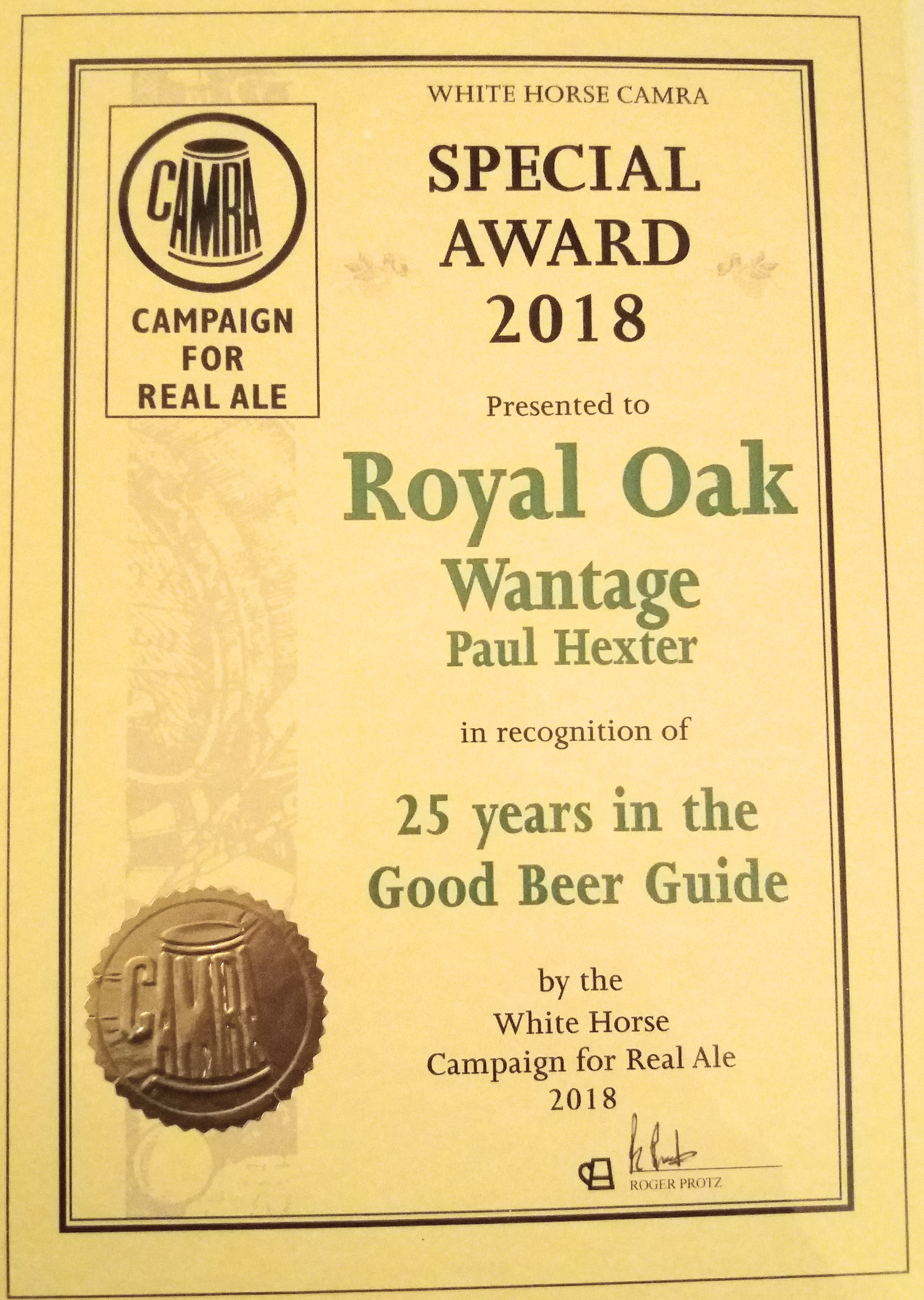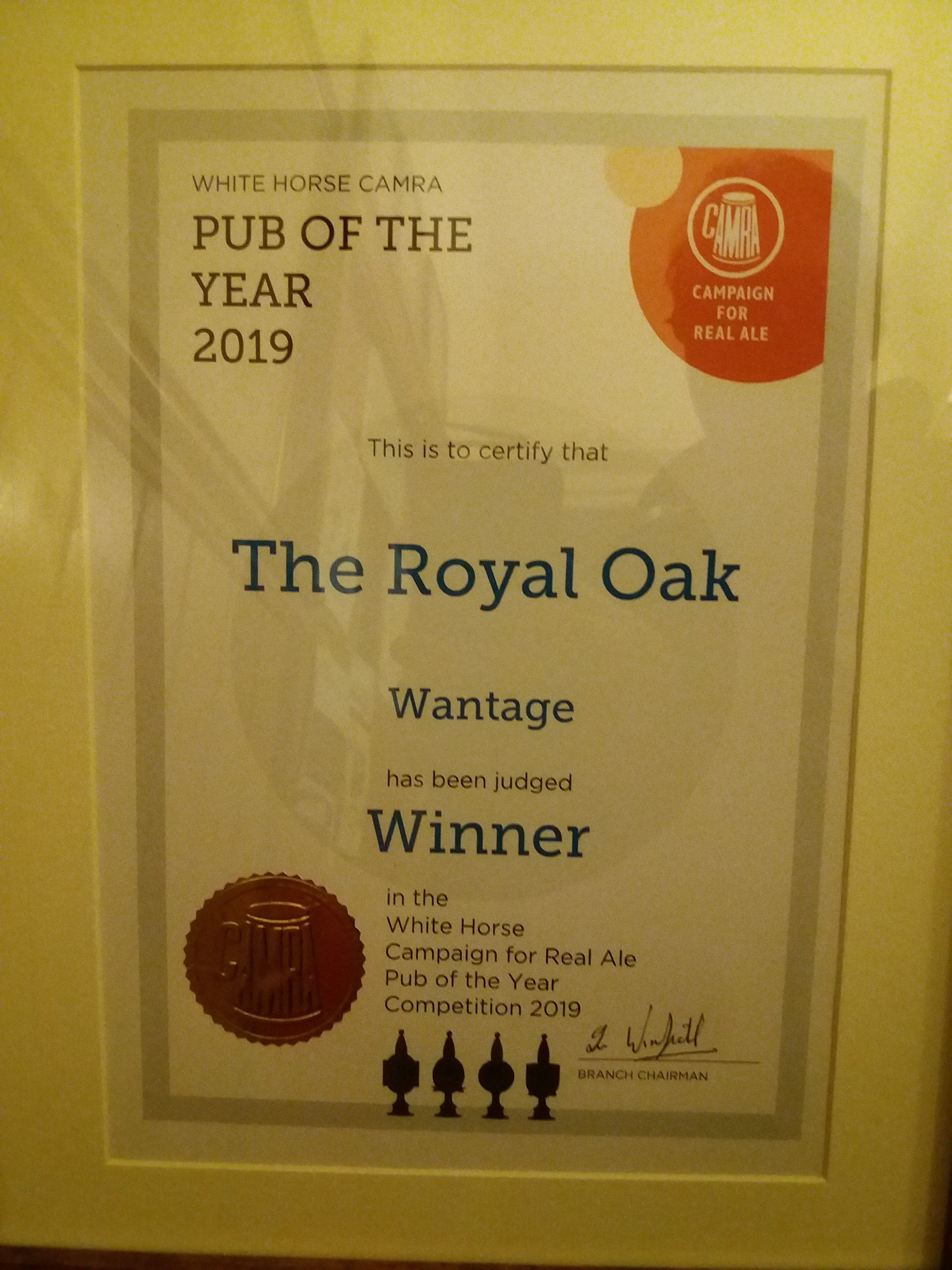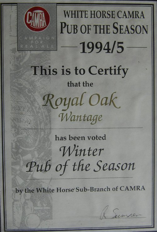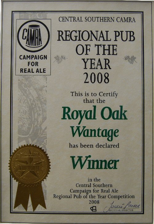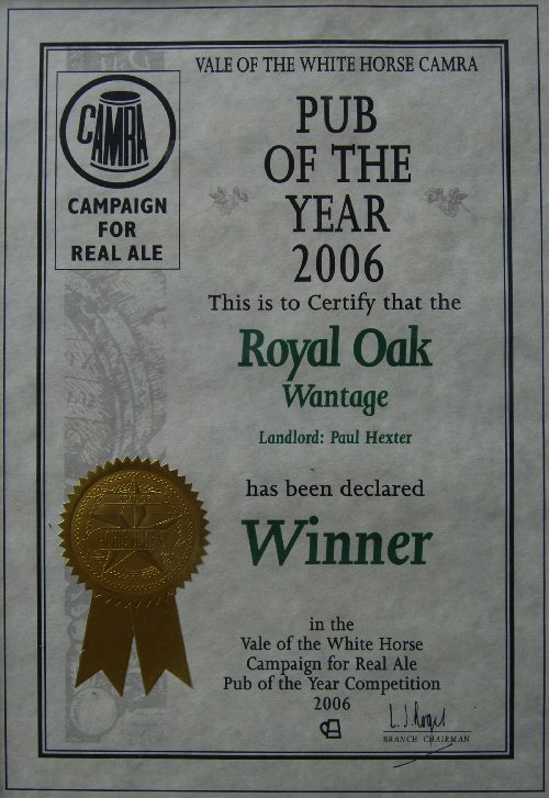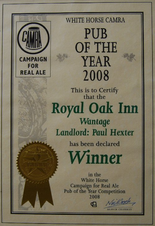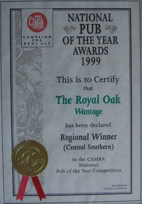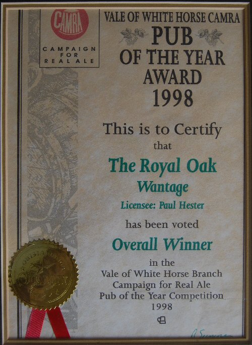 Royal Oak, Wantage Awards Customer Facebook Page We're in the Good Beer Guide! 2019 | 2018 | 2017 | 2016 | 2015 | 2014 | 2013 | 2012 | 2011 | 2010 | 2009 | 2008 | Earlier 2019 CAMRA White Horse Pub of the Year CAMRA White Horse Cider Pub of the Year 2018 CAMRA Regional Cider Pub of the Year (Central Southern) - Winner CAMRA Special Award: 25 years in the "Good Beer Guide" 2017 Return to Top CAMRA White Horse Pub of the Year CAMRA White Horse Cider Pub of the Year 2016 Return to Top CAMRA White Horse Pub of the Year CAMRA White Horse Cider Pub of the Year - Runner Up 2015 Return to Top CAMRA White Horse Pub of the Year - Winner 2013 Return to Top CAMRA National Cider Pub of the Year - Finalist CAMRA Regional Cider Pub of the Year (Central Southern) - Winner 2012 Return to Top CAMRA National Cider Pub of the Year - Winner 2011 Return to Top CAMRA National Cider Pub of the Year - Finalist 2010 Return to Top CAMRA Pub of the Year (Oxfordshire) - Winner 2009 Return to Top CAMRA Regional Pub of the Year (Central Southern) - winner CAMRA Regional Cider Pub of the Year - Commended CAMRA White Horse Pub of the Year CAMRAOxfordshire Pub of the Year CAMRAChampion Beer of Britain Dr Hexter's Healer awarded London & Southeast Regional Beer of the Year "Champion Strong Bitter" 2008 Return to Top CAMRA Regional Pub of the Year (Central Southern) CAMRA White Horse Pub of the Year CAMRA Oxfordshire Pub of the Year Reading Beer & Cider Festival: Dr Hexter's Healer awarded Local Beer of the Festival: Premium Bitter Dr Hexter's Healer awarded Local beer of the Festival: GOLD 2006 Return to Top CAMRA Vale of White Horse Pub of the Year 1999 CAMRA Regional Pub of the Year (Central Southern) 1998 CAMRA Vale of White Horse Pub of the Year 1997 CAMRA Northamptonshire Nunn Such Island Beer Festival Dr Hexter's Healer awarded Beer of the Festival Runner-Up 1994/5 CAMRA Vale of White Horse Winter Pub of the Season Return to Top Updated Wednesday, 1 May, 2019