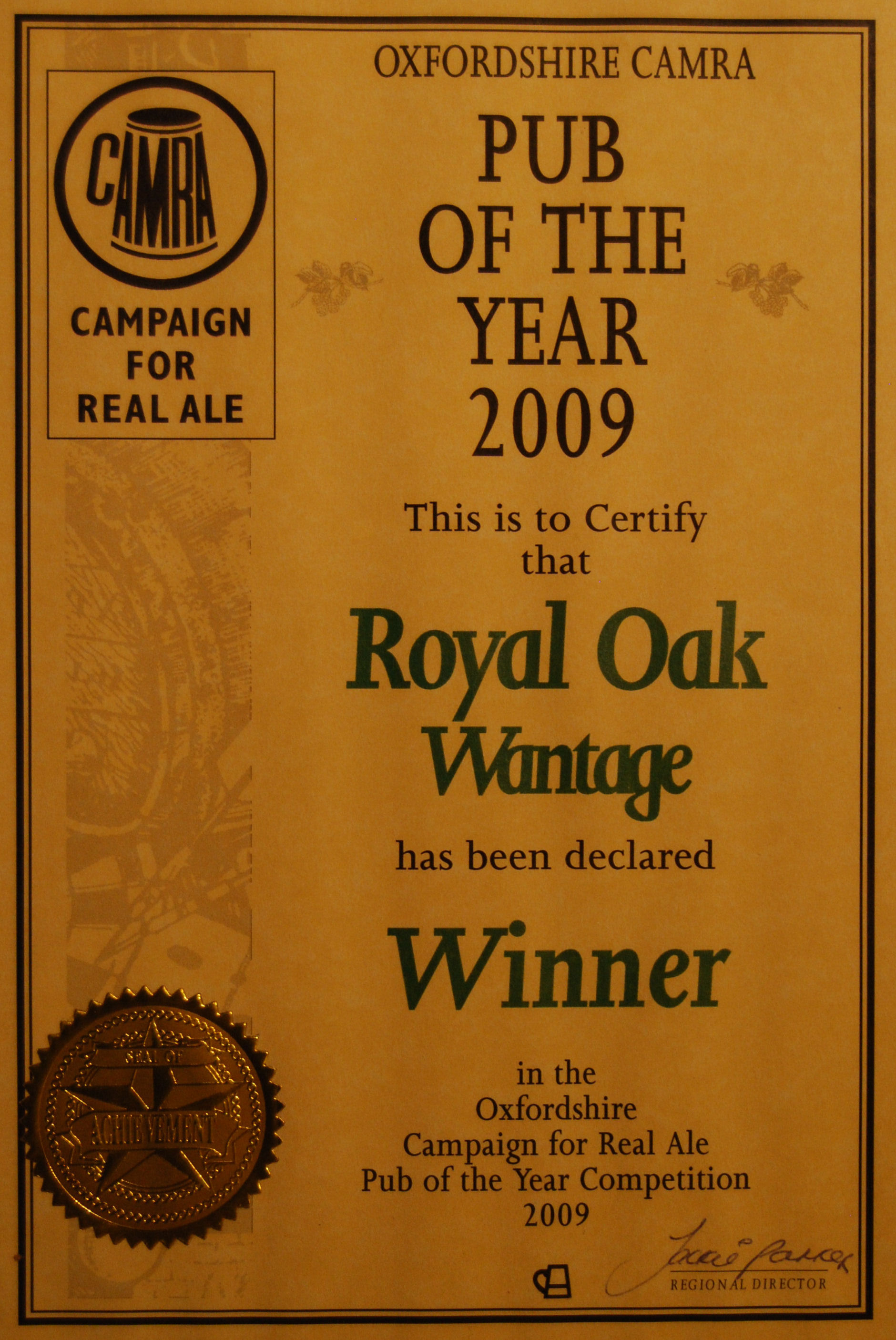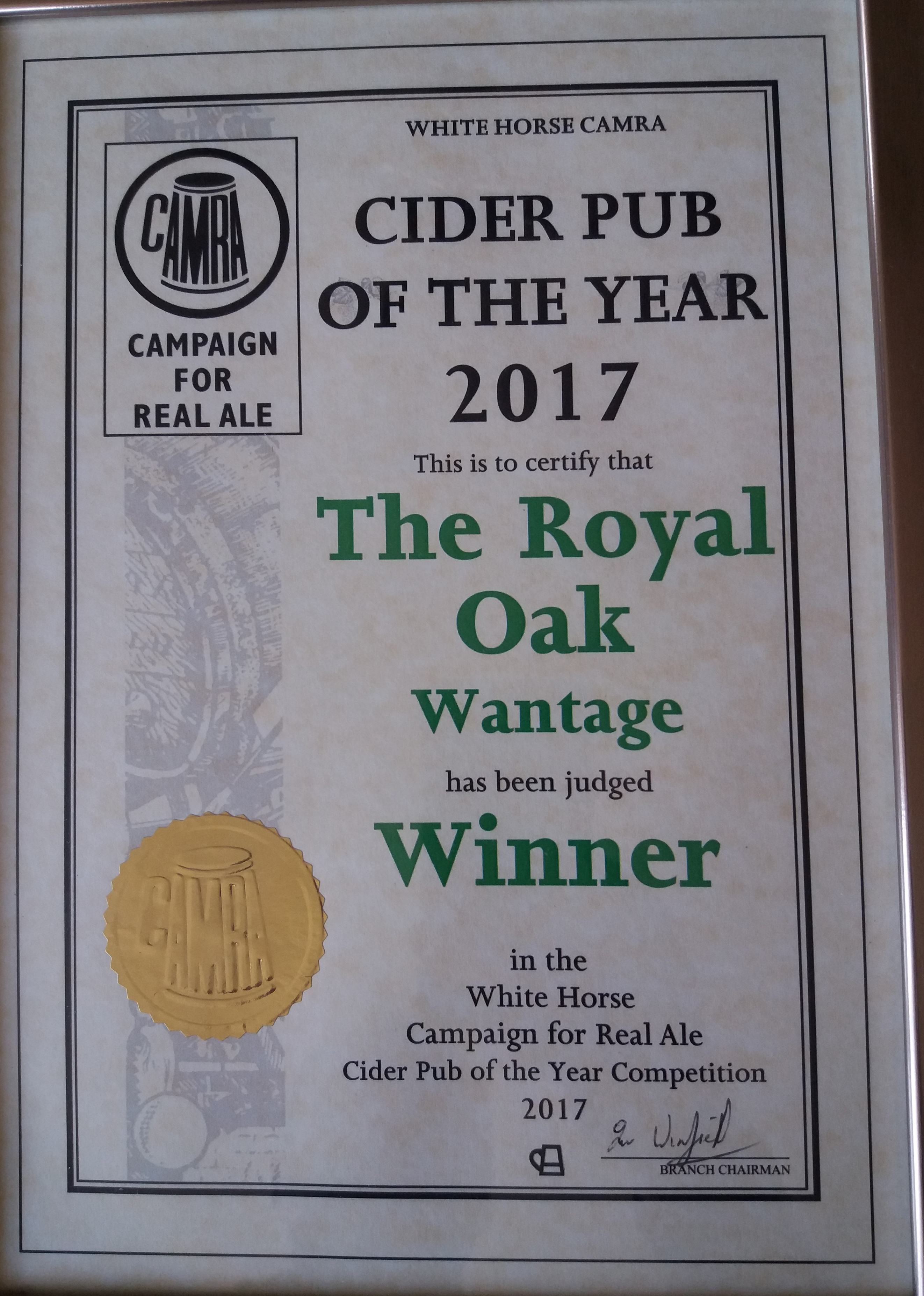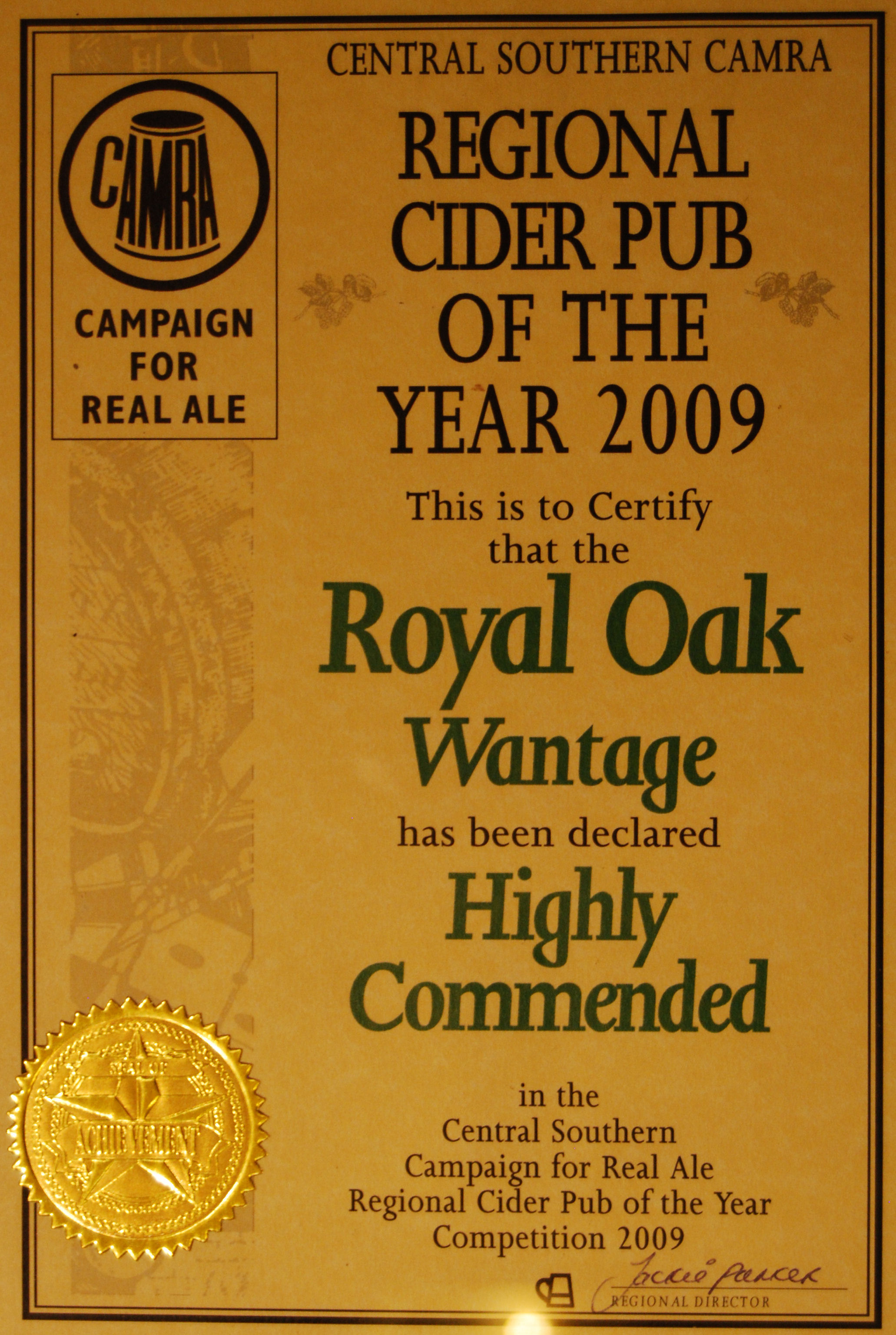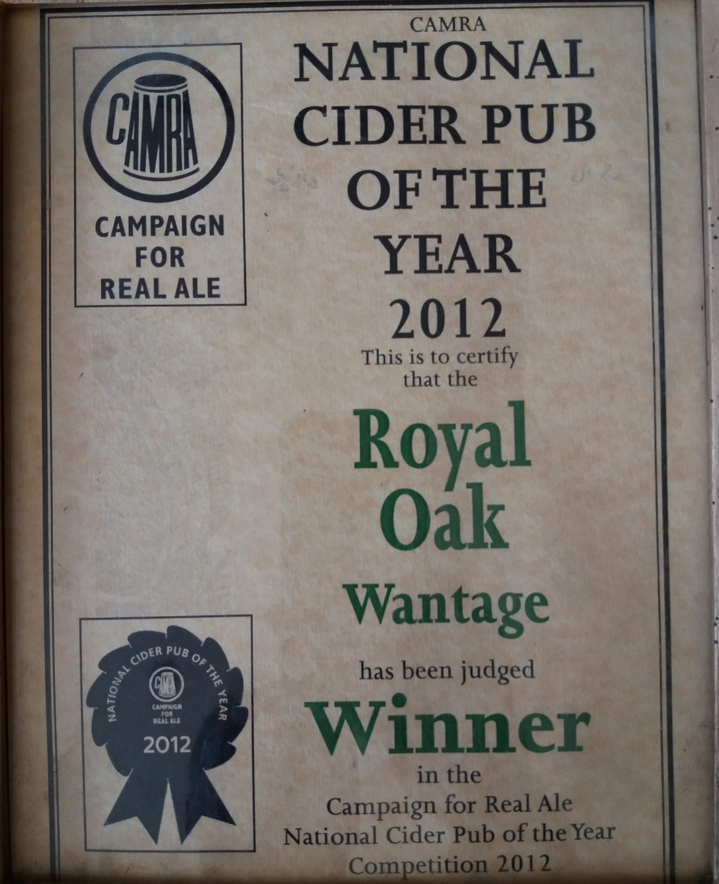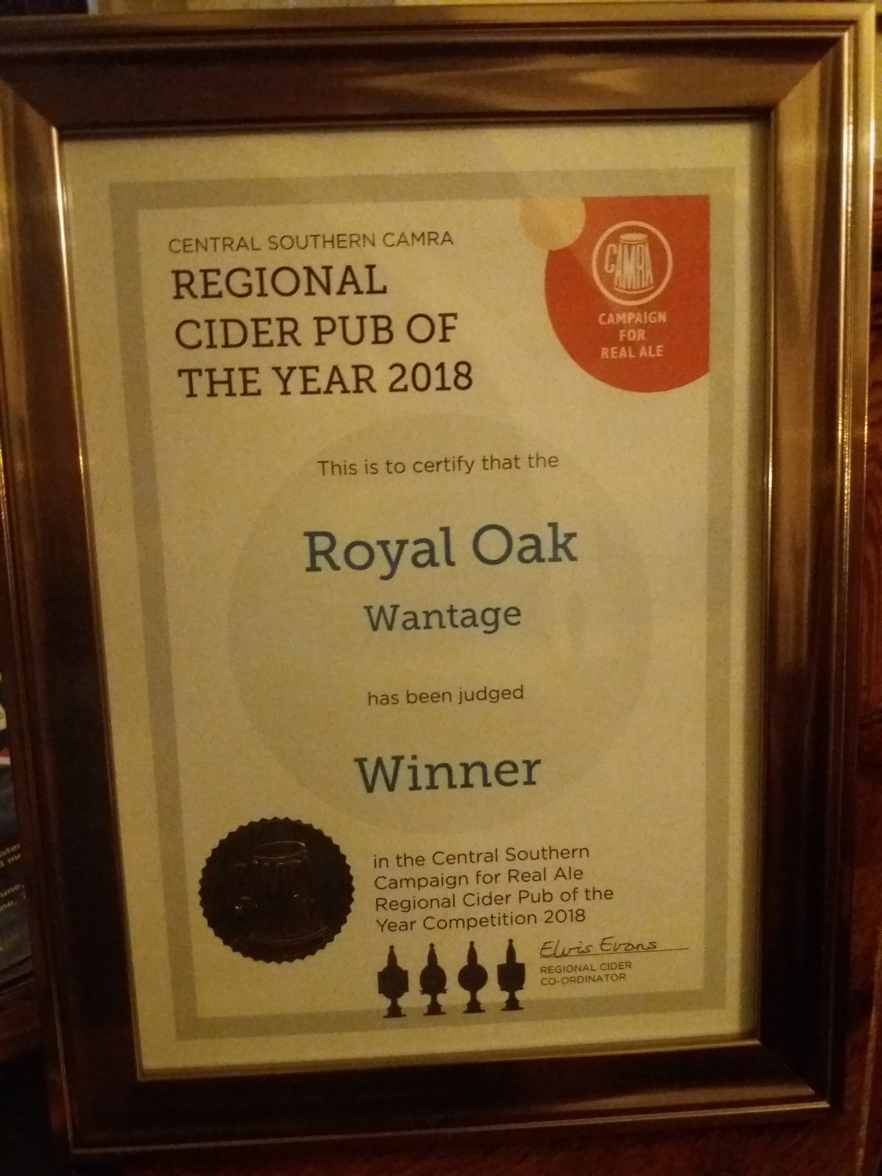Royal Oak, Wantage Awards Customer Facebook Page We're in the Good Beer Guide! 2019 | 2018 | 2017 | 2016 | 2015 | 2014 | 2013 | 2012 | 2011 | 2010 | 2009 | 2008 | Earlier 2019 CAMRA White Horse Pub of the Year CAMRA White Horse Cider Pub of the Year 2018 CAMRA Regional Cider Pub of the Year (Central Southern) - Winner CAMRA Special Award: 25 years in the "Good Beer Guide" 2017 Return to Top CAMRA White Horse Pub of the Year CAMRA White Horse Cider Pub of the Year 2016 Return to Top CAMRA White Horse Pub of the Year CAMRA White Horse Cider Pub of the Year - Runner Up 2015 Return to Top CAMRA White Horse Pub of the Year - Winner 2013 Return to Top CAMRA National Cider Pub of the Year - Finalist CAMRA Regional Cider Pub of the Year (Central Southern) - Winner 2012 Return to Top CAMRA National Cider Pub of the Year - Winner 2011 Return to Top CAMRA National Cider Pub of the Year - Finalist 2010 Return to Top CAMRA Pub of the Year (Oxfordshire) - Winner 2009 Return to Top CAMRA Regional Pub of the Year (Central Southern) - winner CAMRA Regional Cider Pub of the Year - Commended CAMRA White Horse Pub of the Year CAMRAOxfordshire Pub of the Year CAMRAChampion Beer of Britain Dr Hexter's Healer awarded London & Southeast Regional Beer of the Year "Champion Strong Bitter" 2008 Return to Top CAMRA Regional Pub of the Year (Central Southern) CAMRA White Horse Pub of the Year CAMRA Oxfordshire Pub of the Year Reading Beer & Cider Festival: Dr Hexter's Healer awarded Local Beer of the Festival: Premium Bitter Dr Hexter's Healer awarded Local beer of the Festival: GOLD 2006 Return to Top CAMRA Vale of White Horse Pub of the Year 1999 CAMRA Regional Pub of the Year (Central Southern) 1998 CAMRA Vale of White Horse Pub of the Year 1997 CAMRA Northamptonshire Nunn Such Island Beer Festival Dr Hexter's Healer awarded Beer of the Festival Runner-Up 1994/5 CAMRA Vale of White Horse Winter Pub of the Season Return to Top Updated Wednesday, 1 May, 2019