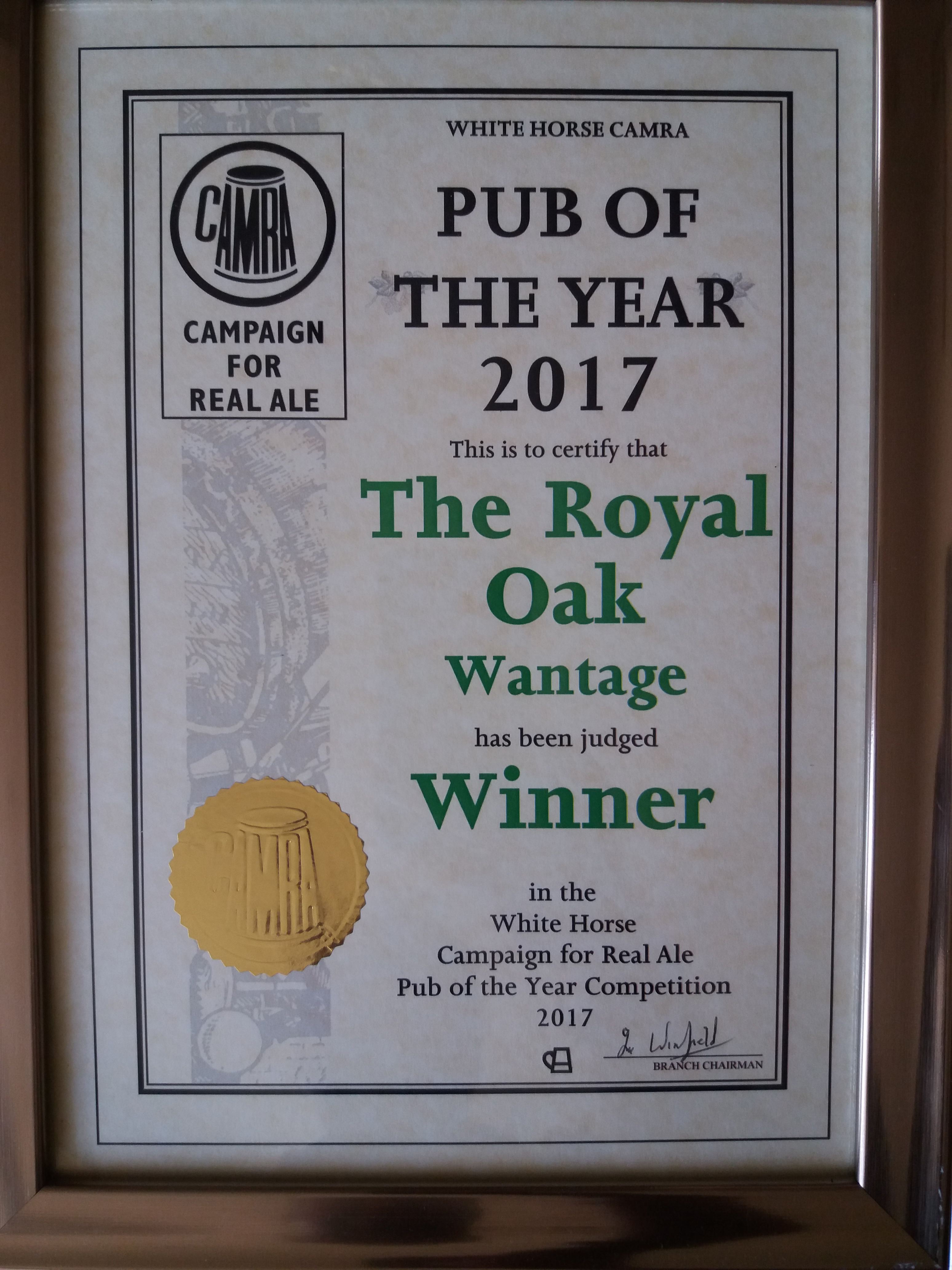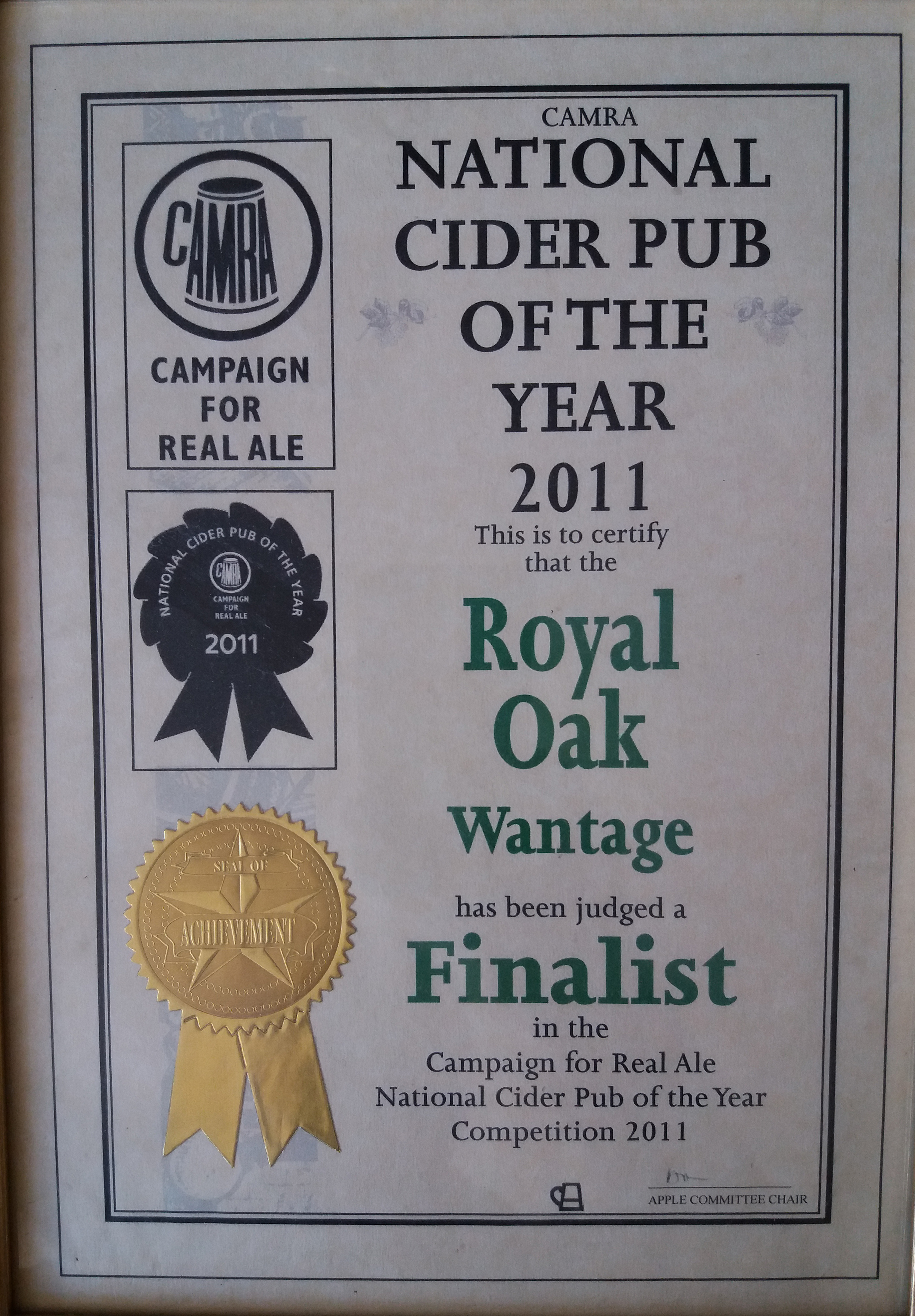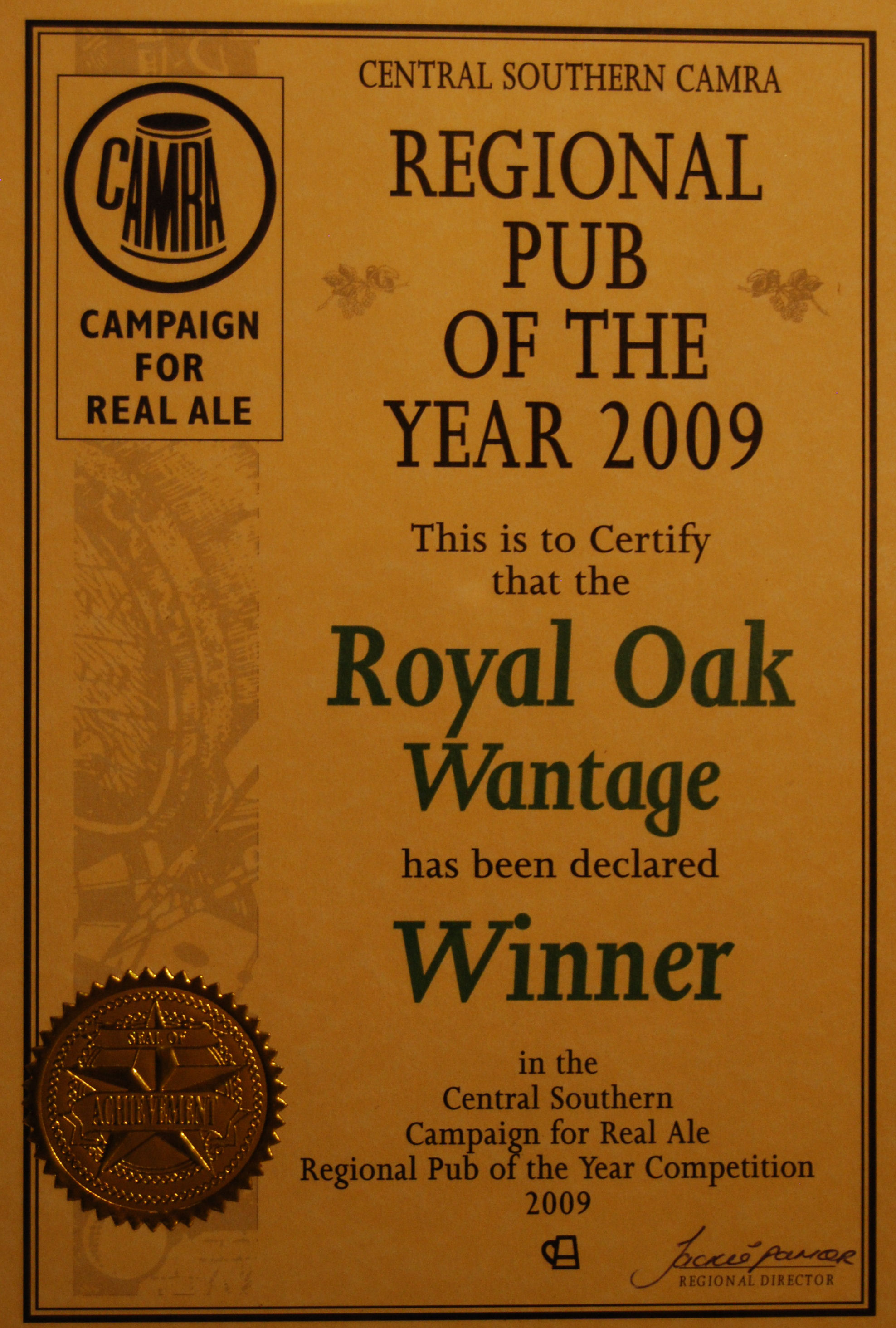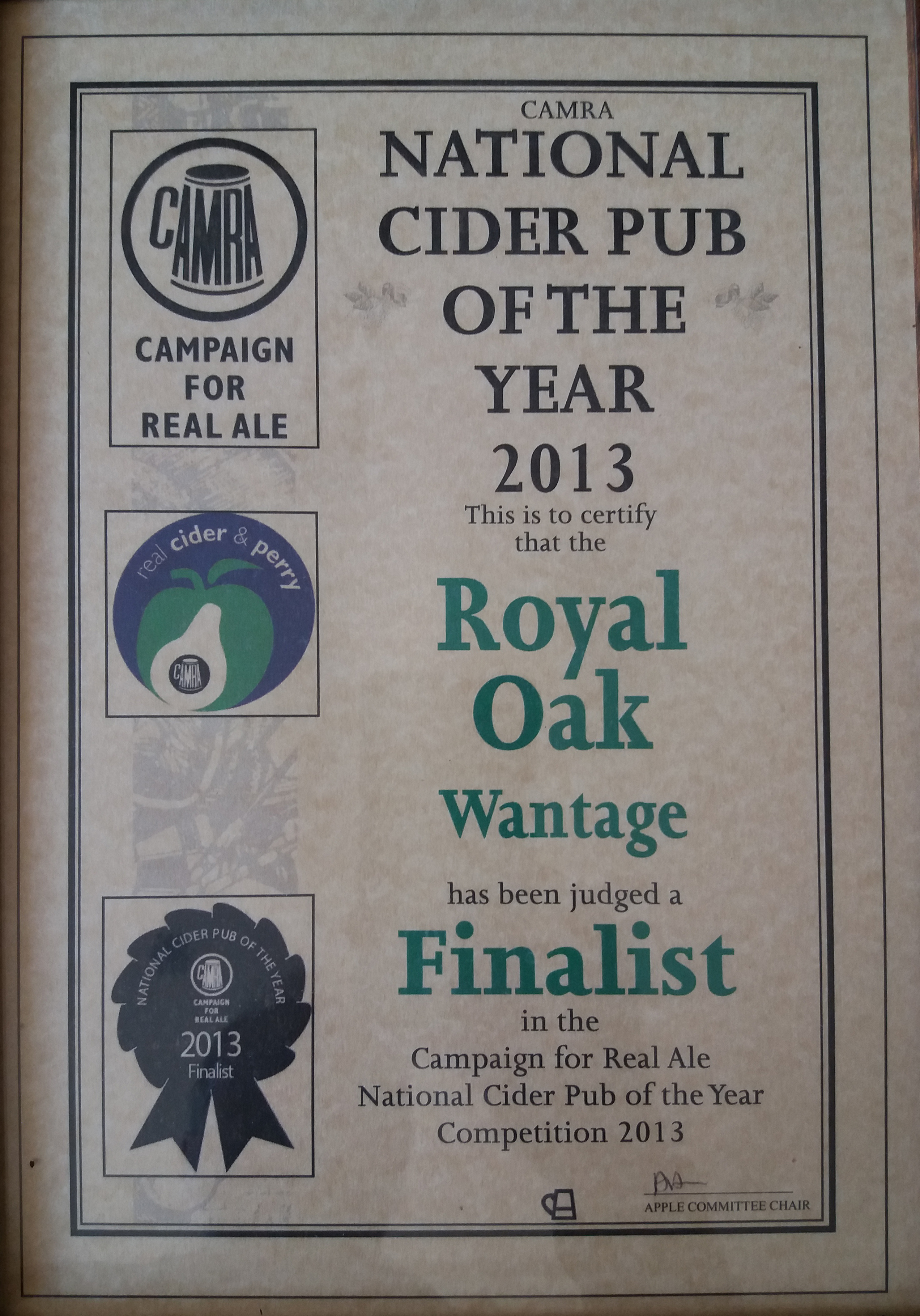 Royal Oak, Wantage Awards Customer Facebook Page We're in the Good Beer Guide! 2019 | 2018 | 2017 | 2016 | 2015 | 2014 | 2013 | 2012 | 2011 | 2010 | 2009 | 2008 | Earlier 2019 CAMRA White Horse Pub of the Year CAMRA White Horse Cider Pub of the Year 2018 CAMRA Regional Cider Pub of the Year (Central Southern) - Winner CAMRA Special Award: 25 years in the "Good Beer Guide" 2017 Return to Top CAMRA White Horse Pub of the Year CAMRA White Horse Cider Pub of the Year 2016 Return to Top CAMRA White Horse Pub of the Year CAMRA White Horse Cider Pub of the Year - Runner Up 2015 Return to Top CAMRA White Horse Pub of the Year - Winner 2013 Return to Top CAMRA National Cider Pub of the Year - Finalist CAMRA Regional Cider Pub of the Year (Central Southern) - Winner 2012 Return to Top CAMRA National Cider Pub of the Year - Winner 2011 Return to Top CAMRA National Cider Pub of the Year - Finalist 2010 Return to Top CAMRA Pub of the Year (Oxfordshire) - Winner 2009 Return to Top CAMRA Regional Pub of the Year (Central Southern) - winner CAMRA Regional Cider Pub of the Year - Commended CAMRA White Horse Pub of the Year CAMRAOxfordshire Pub of the Year CAMRAChampion Beer of Britain Dr Hexter's Healer awarded London & Southeast Regional Beer of the Year "Champion Strong Bitter" 2008 Return to Top CAMRA Regional Pub of the Year (Central Southern) CAMRA White Horse Pub of the Year CAMRA Oxfordshire Pub of the Year Reading Beer & Cider Festival: Dr Hexter's Healer awarded Local Beer of the Festival: Premium Bitter Dr Hexter's Healer awarded Local beer of the Festival: GOLD 2006 Return to Top CAMRA Vale of White Horse Pub of the Year 1999 CAMRA Regional Pub of the Year (Central Southern) 1998 CAMRA Vale of White Horse Pub of the Year 1997 CAMRA Northamptonshire Nunn Such Island Beer Festival Dr Hexter's Healer awarded Beer of the Festival Runner-Up 1994/5 CAMRA Vale of White Horse Winter Pub of the Season Return to Top Updated Wednesday, 1 May, 2019