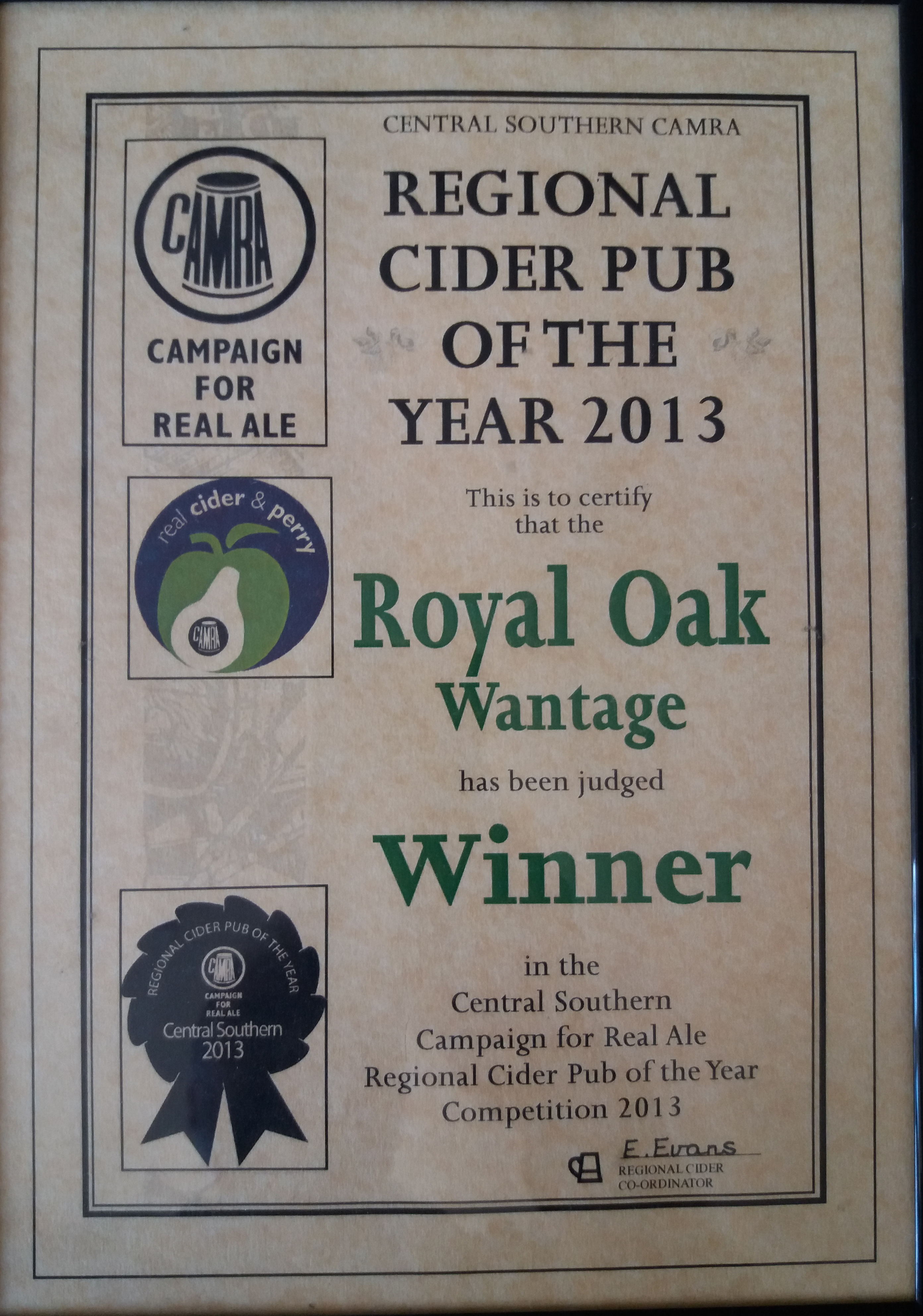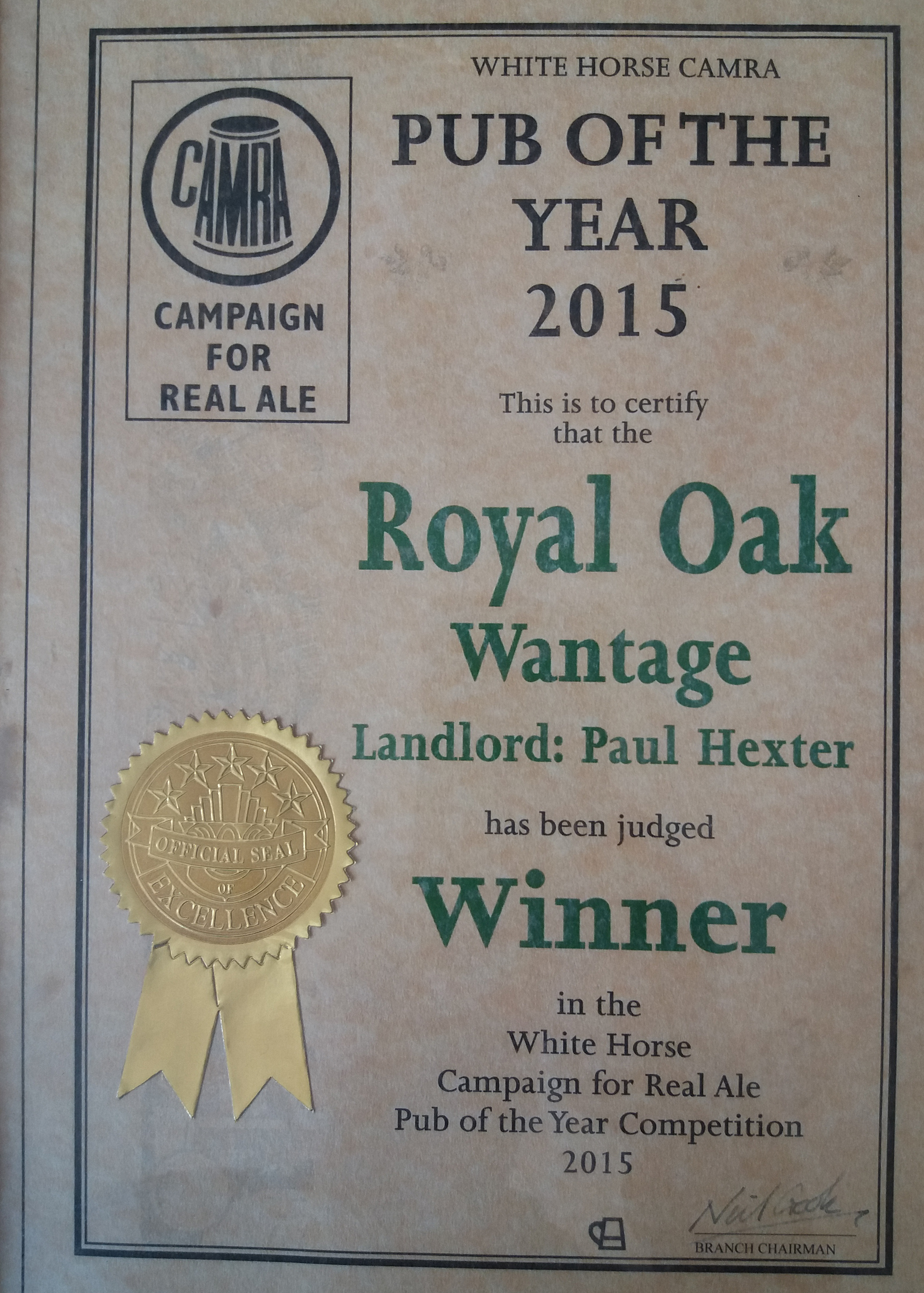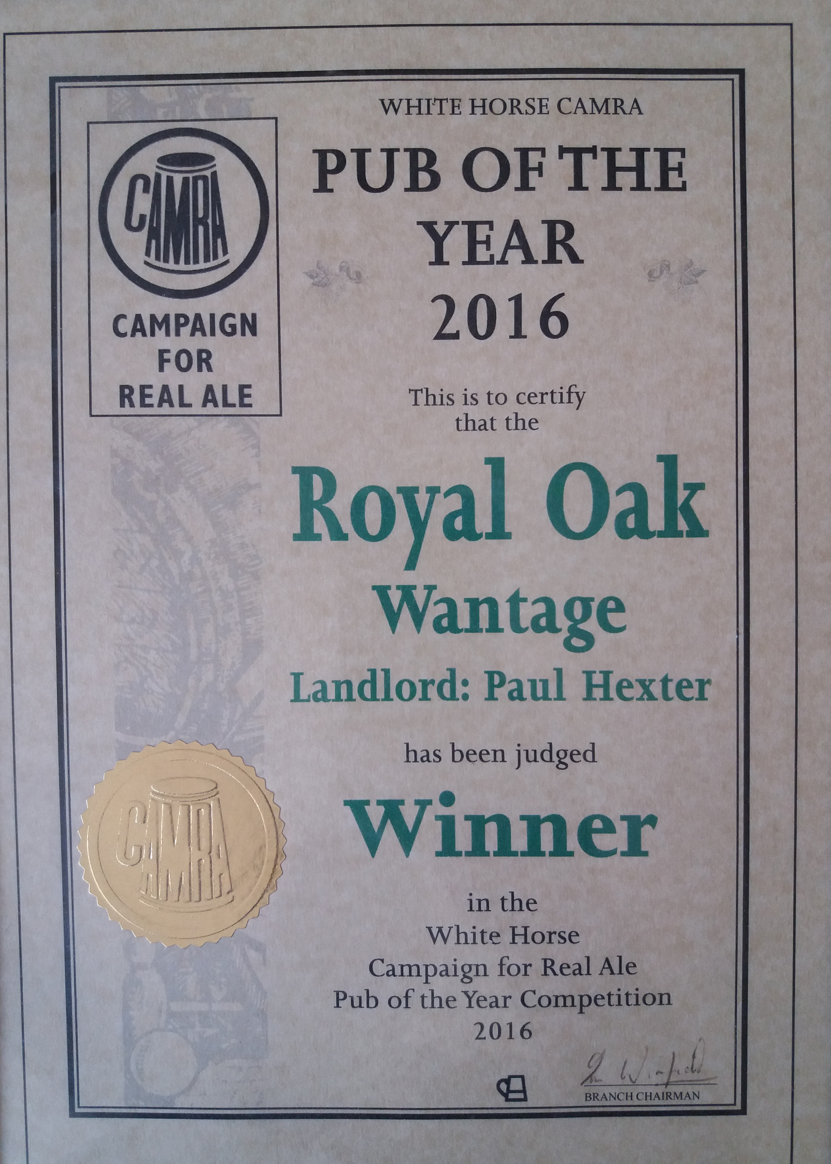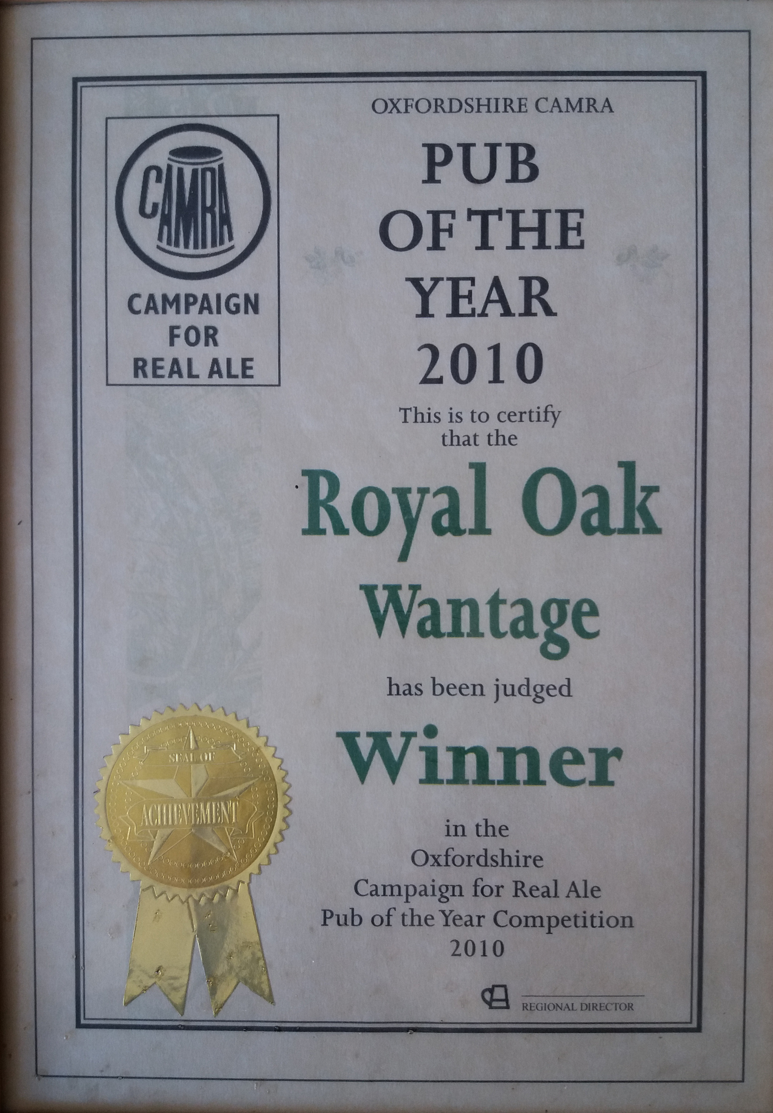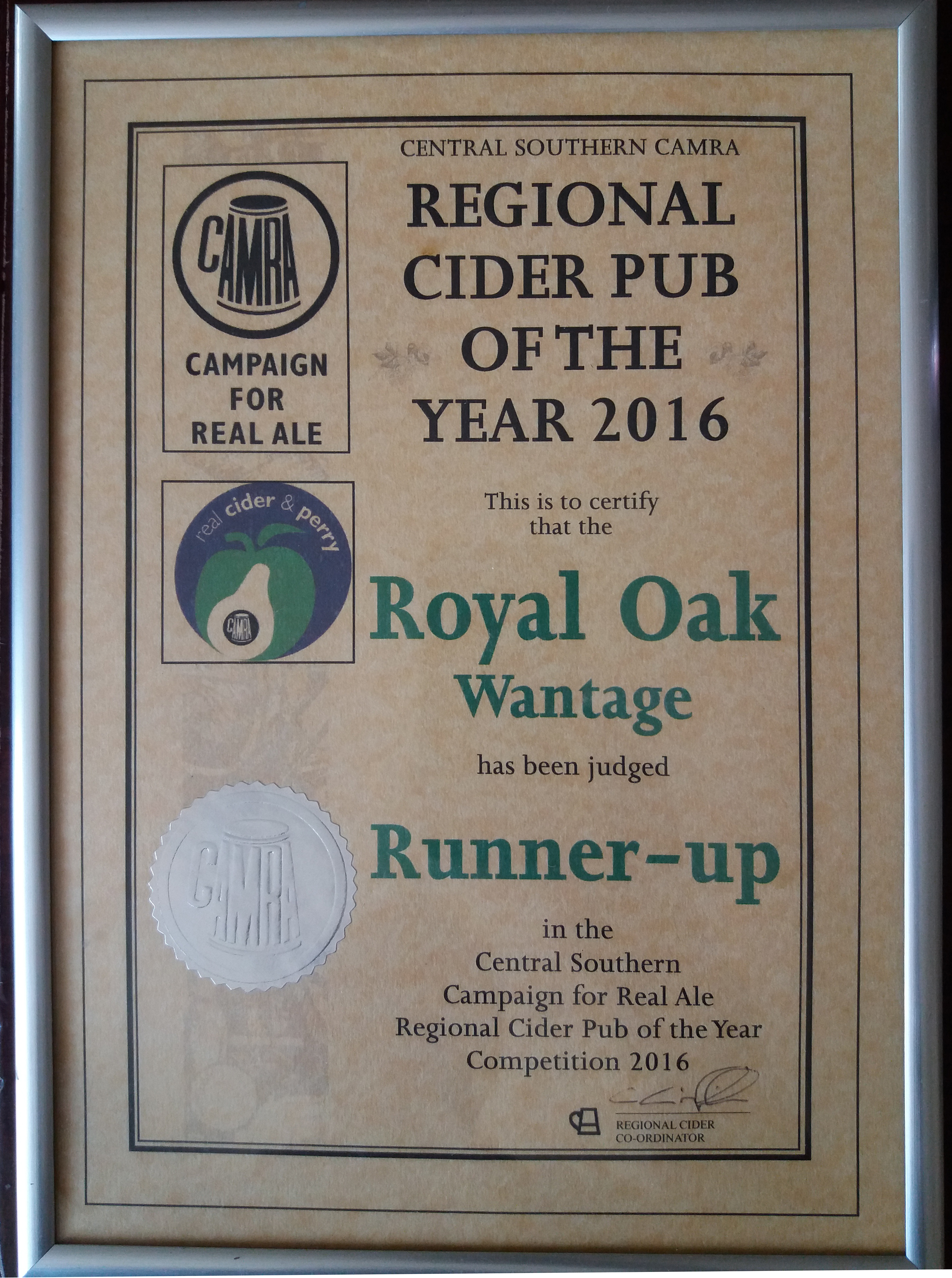Royal Oak, Wantage Awards Customer Facebook Page We're in the Good Beer Guide! 2019 | 2018 | 2017 | 2016 | 2015 | 2014 | 2013 | 2012 | 2011 | 2010 | 2009 | 2008 | Earlier 2019 CAMRA White Horse Pub of the Year CAMRA White Horse Cider Pub of the Year 2018 CAMRA Regional Cider Pub of the Year (Central Southern) - Winner CAMRA Special Award: 25 years in the "Good Beer Guide" 2017 Return to Top CAMRA White Horse Pub of the Year CAMRA White Horse Cider Pub of the Year 2016 Return to Top CAMRA White Horse Pub of the Year CAMRA White Horse Cider Pub of the Year - Runner Up 2015 Return to Top CAMRA White Horse Pub of the Year - Winner 2013 Return to Top CAMRA National Cider Pub of the Year - Finalist CAMRA Regional Cider Pub of the Year (Central Southern) - Winner 2012 Return to Top CAMRA National Cider Pub of the Year - Winner 2011 Return to Top CAMRA National Cider Pub of the Year - Finalist 2010 Return to Top CAMRA Pub of the Year (Oxfordshire) - Winner 2009 Return to Top CAMRA Regional Pub of the Year (Central Southern) - winner CAMRA Regional Cider Pub of the Year - Commended CAMRA White Horse Pub of the Year CAMRAOxfordshire Pub of the Year CAMRAChampion Beer of Britain Dr Hexter's Healer awarded London & Southeast Regional Beer of the Year "Champion Strong Bitter" 2008 Return to Top CAMRA Regional Pub of the Year (Central Southern) CAMRA White Horse Pub of the Year CAMRA Oxfordshire Pub of the Year Reading Beer & Cider Festival: Dr Hexter's Healer awarded Local Beer of the Festival: Premium Bitter Dr Hexter's Healer awarded Local beer of the Festival: GOLD 2006 Return to Top CAMRA Vale of White Horse Pub of the Year 1999 CAMRA Regional Pub of the Year (Central Southern) 1998 CAMRA Vale of White Horse Pub of the Year 1997 CAMRA Northamptonshire Nunn Such Island Beer Festival Dr Hexter's Healer awarded Beer of the Festival Runner-Up 1994/5 CAMRA Vale of White Horse Winter Pub of the Season Return to Top Updated Wednesday, 1 May, 2019